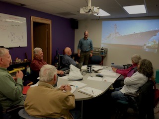 Joining CDR Mahon for the Discussion Group were Joe Valenta, Harry Stengele, Floyd Kershner, John Laible and Cricket Laible and their guest Nancy Balin, Mike Graff and Solon Webb (by Skype from Portland).