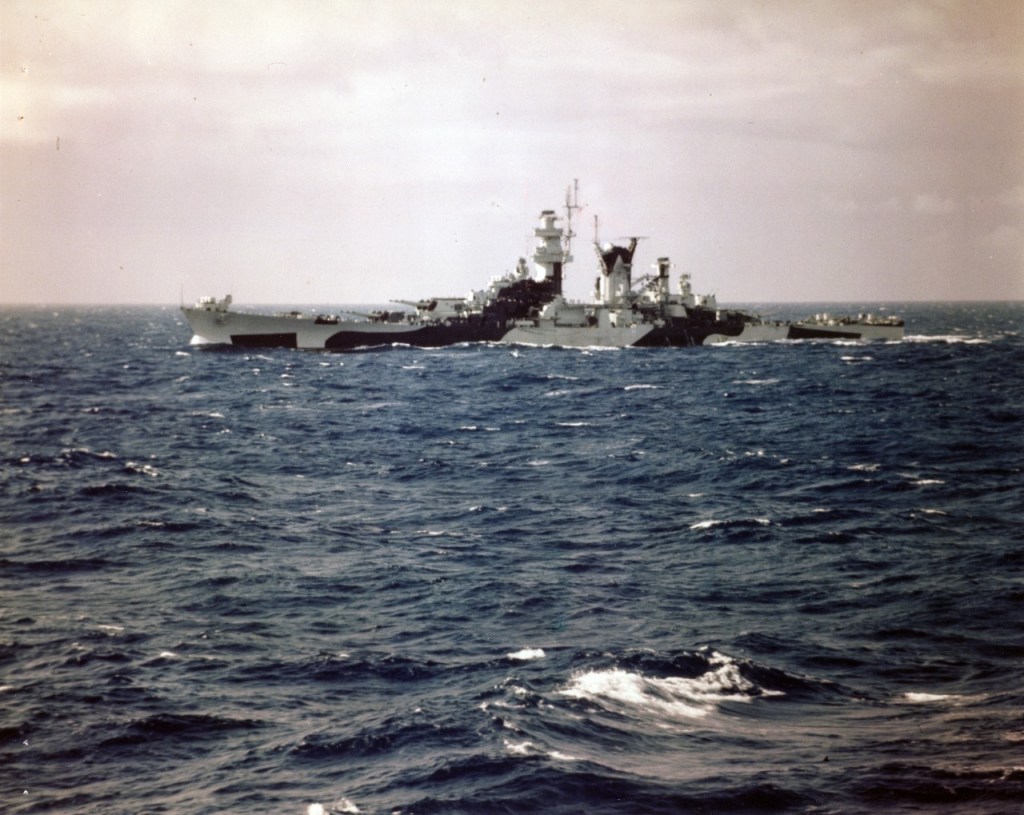 Description: USS Alaska (CB-1) Photographed from USS Missouri (BB-63) off the U.S. east coast during their shakedown cruise together in August 1944. Note her Measure 32 camouflage.